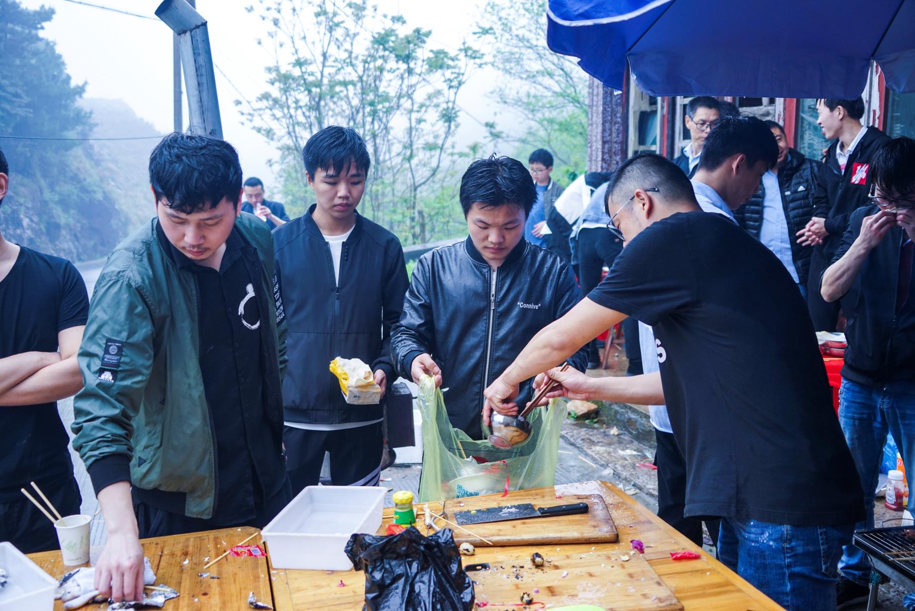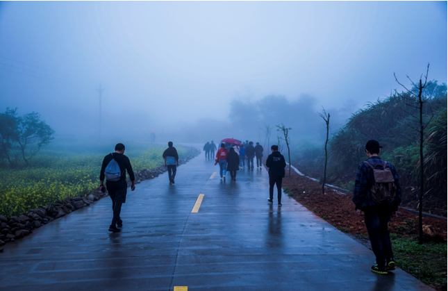 在各組成員吃飽喝足充滿(mǎn)能量之后 ,開(kāi)始了此次活動(dòng)最高潮部分——暴走。在開(kāi)始暴走之前,參加暴走的全體成員在自行車(chē)協(xié)會(huì)牌前集合進(jìn)行了合影留念,之后開(kāi)始了暴走活動(dòng)。天氣依然是跟早上一樣,三米開(kāi)外的地方,似乎什么都看不清了,天空中也下著蒙蒙細(xì)雨,但一點(diǎn)也不影響我們的心情。大家一邊歡快地聊著天,一邊向上地攀登者。享受著霧蒙蒙的風(fēng)景,在這詩(shī)情畫(huà)意中繼續(xù)著。很快我們從平坦的水泥路轉(zhuǎn)到了泥濘的山路中。疊翠的峰巒、茂密的森林和曲折盤(pán)旋的山路讓我們不禁陶醉其中,盡情領(lǐng)略大自然的風(fēng)情。各個(gè)部門(mén)之間都彼此相互鼓勵(lì)、相互協(xié)助,不斷挑戰(zhàn)著自己。