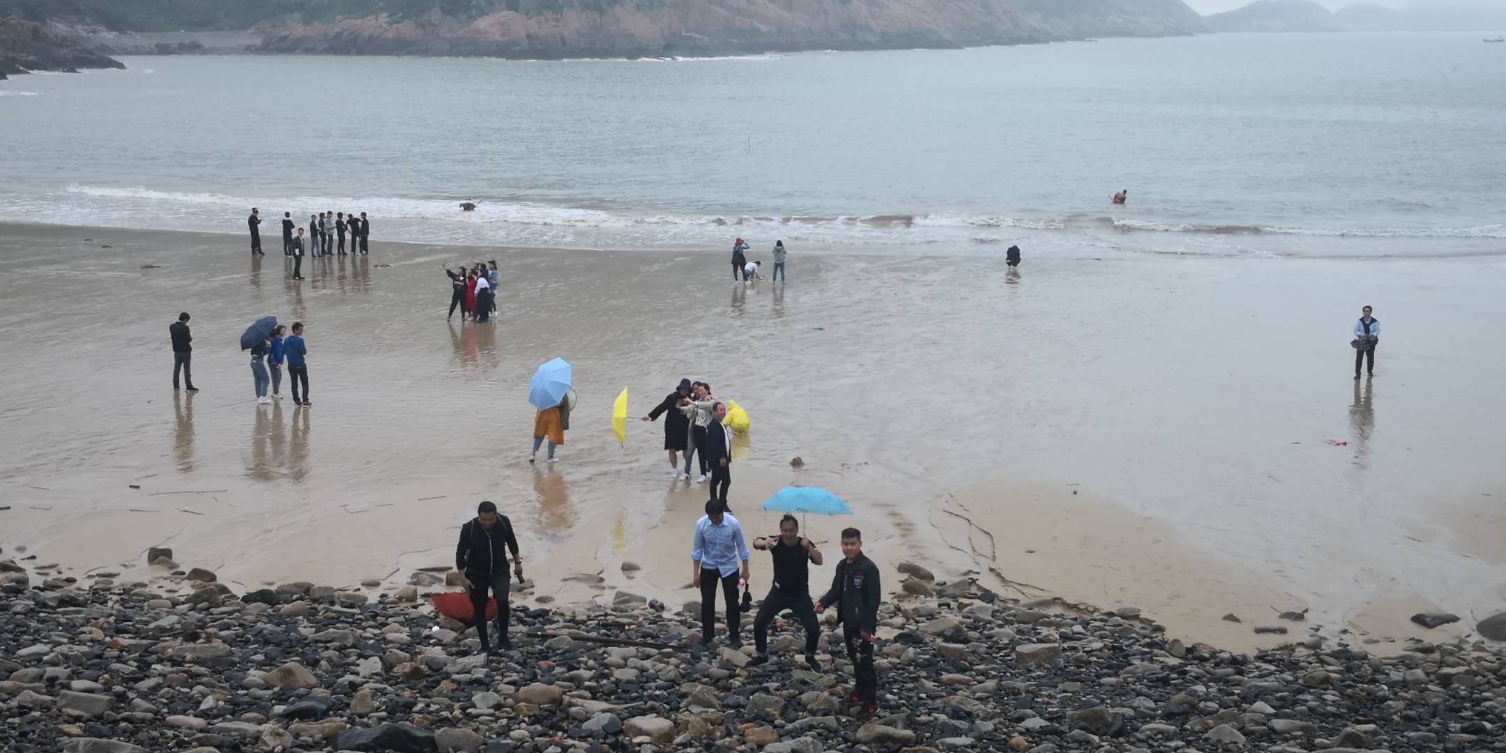 中轉(zhuǎn)站我們定在了大坑沙的沙灘上。這是一片幾乎被遺忘的原生態(tài)沙灘。沙灘的兩側(cè)是飽受海水侵蝕的礁石,形態(tài)各異。黑白相間的鵝軟石占據(jù)了這片沙灘。到時(shí)正趕上潮平似退未退時(shí),在平坦結(jié)實(shí)的沙灘上走一走,迎面而來(lái)的潮水似進(jìn)又退,不知不覺(jué)中也跟著他的步子,一步步走向大海,在潮水中嬉戲。不一會(huì),天空下起了雨,似有留客的意思。